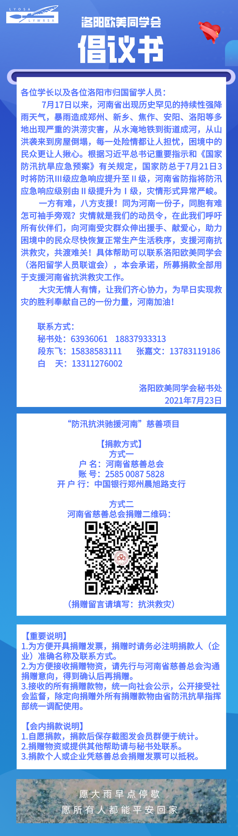 乡情大爱,共渡难关。风雨面前大家一起扛,洛阳欧美同学会会员及企业用实际行动诠释了中国人民面对灾难彰显的团结和大爱,守望相助,重建家园。