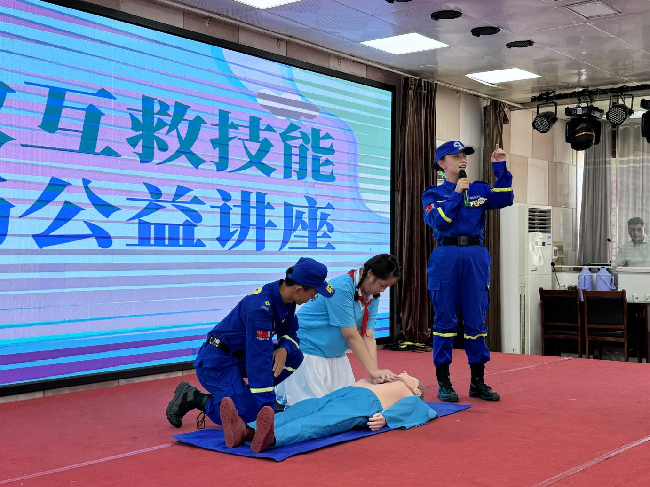 在启动仪式上,蓝天救援队向学校赠送了“少年急救官生命教育科学艺术展”公益海报,并带来了精彩的自救互救技能现场公益讲座。讲座气氛热烈,学生们争相举手答题,积极体验心肺复苏、海姆立克急救法,热情的互动加深了学生们对救援知识的理解,培养了大家的风险识别和自救互救能力,帮助大家建立敬畏生命的意识、保护生命的能力、珍爱生命的态度。
